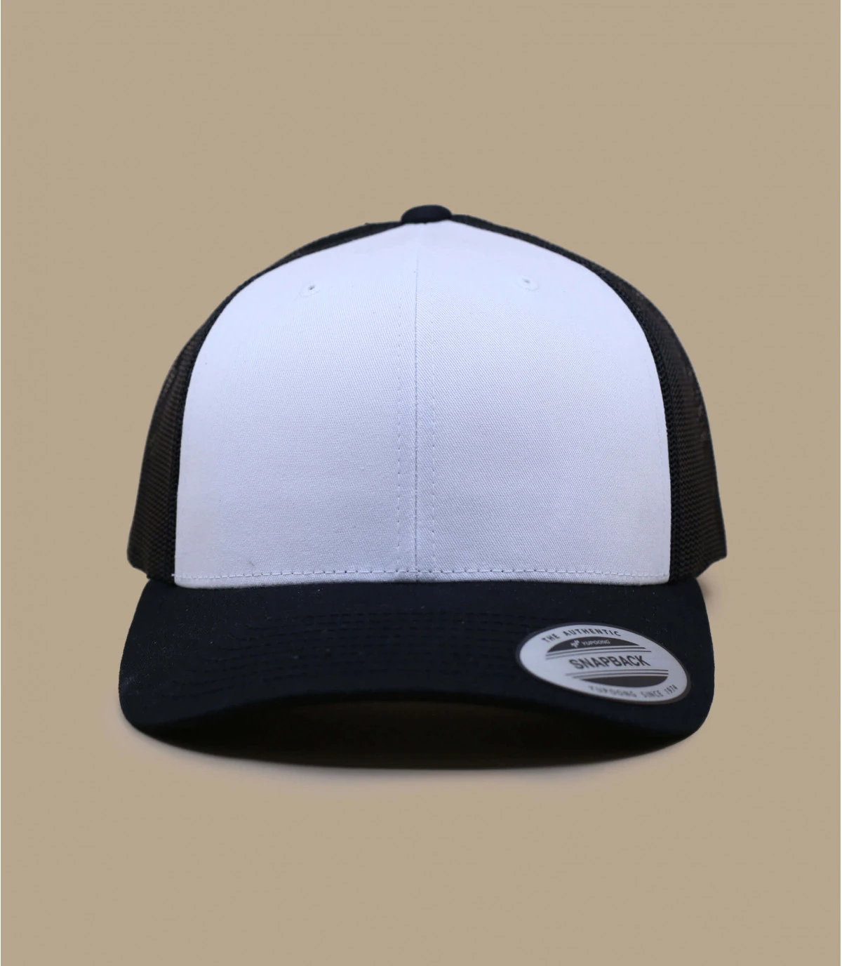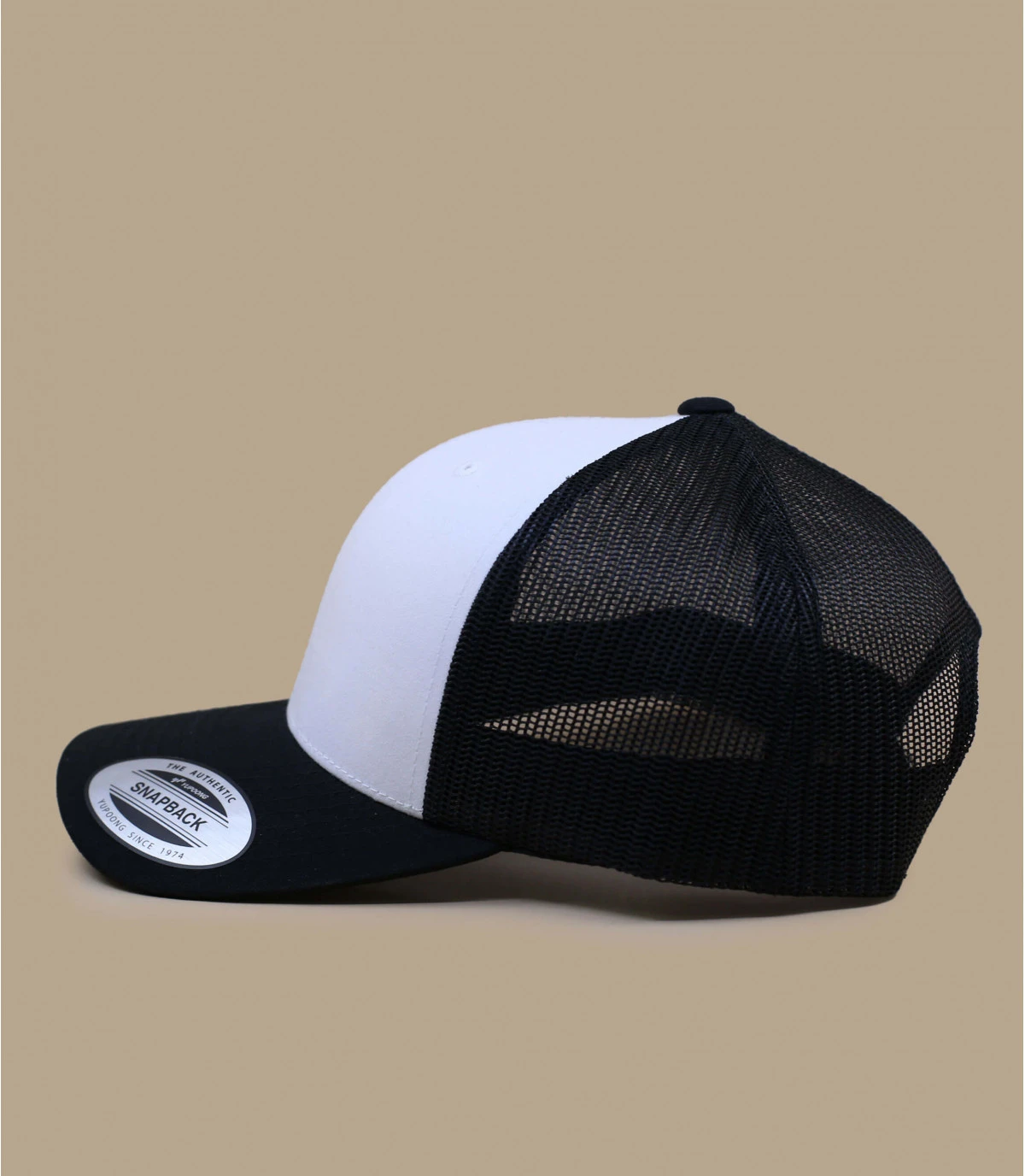 Casquette Trucker blanche avec filet et visière noirs. Languette de réglage à l’arrière, tour de tête 56-60 cm.